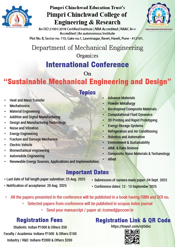 The 1st International Conference on “Sustainable Mechanical Engineering and Design” [ICSMED 2025] focuses on innovative approaches and advancements in technology that promote sustainability. In the face of unprecedented environmental challenges and the urgent need for sustainable development, the International Conference on Sustainable Technology convenes a diverse assembly of scholars, industry leaders, policymakers, and advocates dedicated to advancing sustainable practices and innovations. This conference serves as a vital platform for sharing knowledge, showcasing cutting-edge research, and fostering collaborative solutions that address the complex interplay between technology and sustainability. Recognizing that the health of our planet is intricately linked to our technological advancements, we aim to explore pathways that not only mitigate environmental impact but also promote social equity and economic resilience. Through engaging discussions, hands-on workshops, and dynamic presentations, we aspire to inspire action and empower stakeholders to implement sustainable technologies that pave the way for a more sustainable future. Together, let us harness the power of innovation and collaboration to create solutions that benefit both current and future generations....